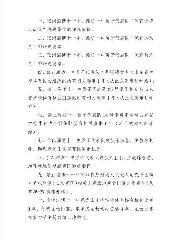 山东省学校体育协会关于对2025-26耐克中国高中篮球联赛(山东赛区)男子组淄博十一中VS潍坊一中代表队的处罚通告,具体如下: