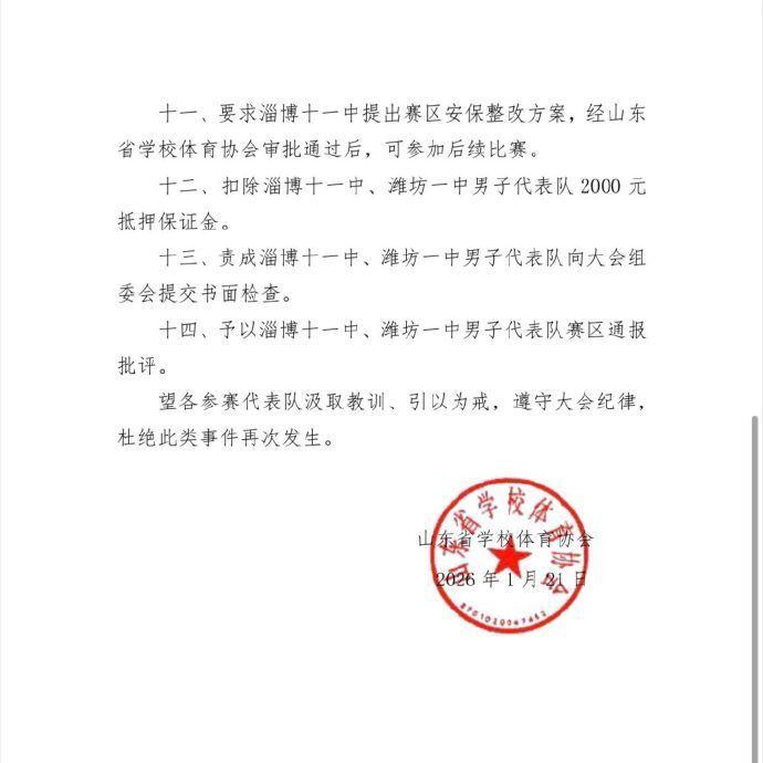 11、要求淄博十一中提出赛区安保整改方案,经山东省学校体育协会审批通过后,可参加后续比赛。