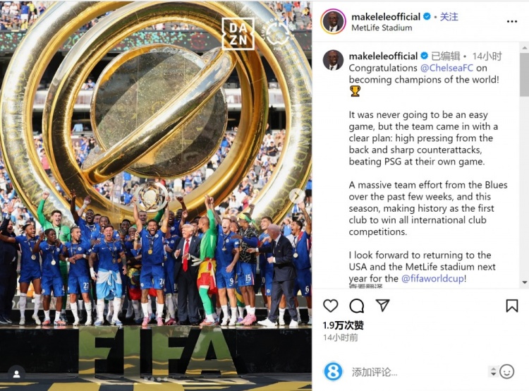 切尔西名宿马克莱莱在社交媒体上写道:“祝贺切尔西成为世界冠军!🏆