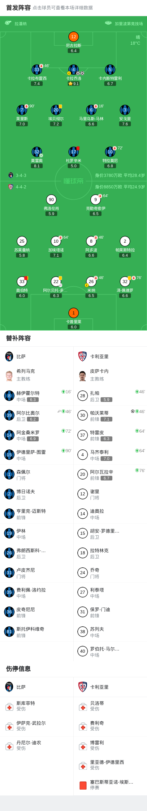 kaiyun-比萨3-1卡利亚里,卡拉乔洛梅开二度,莫雷奥点射破门